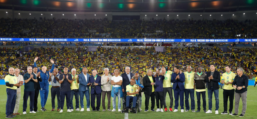 Durante a vitória da seleção brasileira, a CBF reuniu 21 campeões mundiais para prestigiar a equipe e receber homenagens especiais.